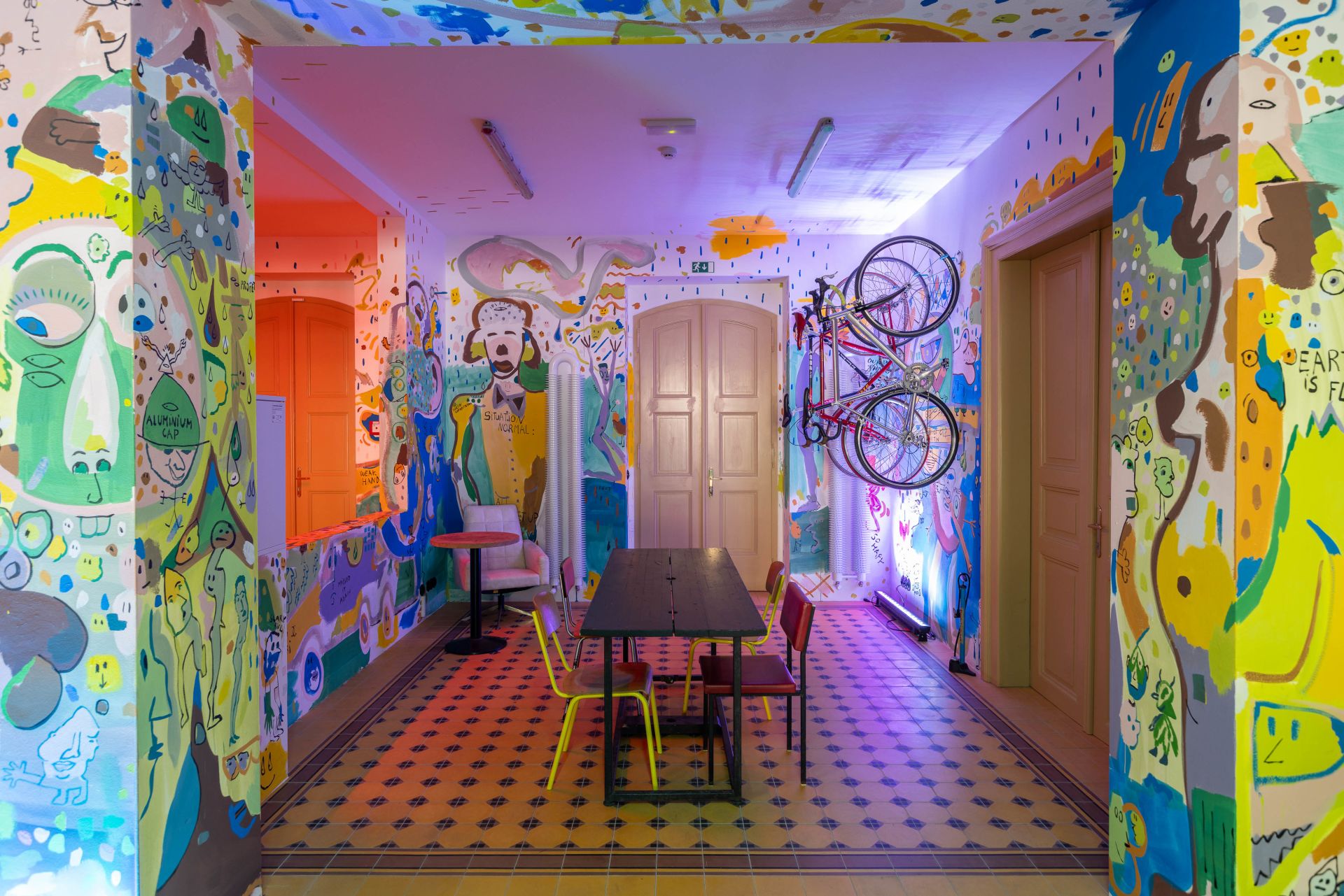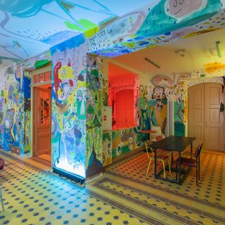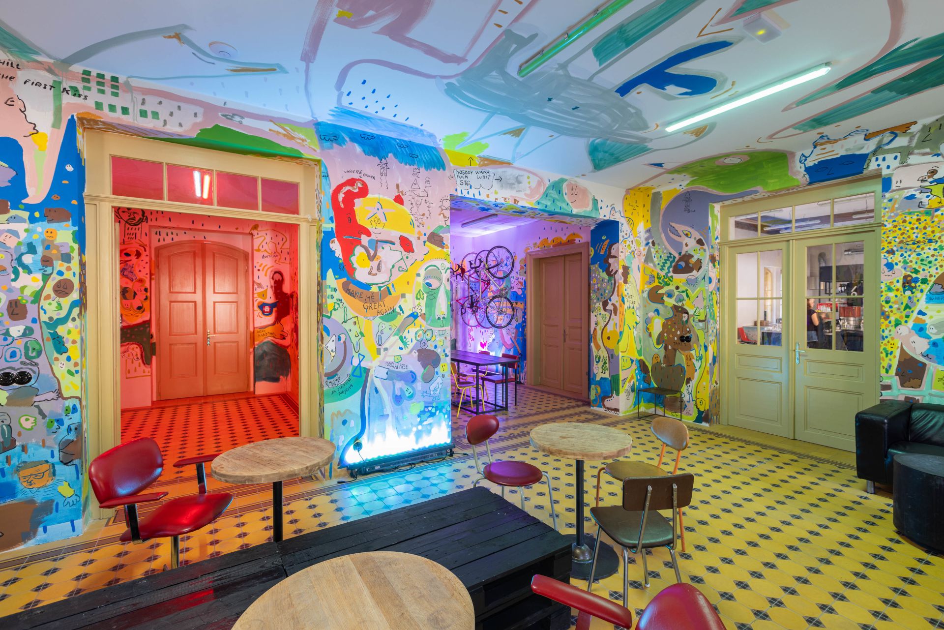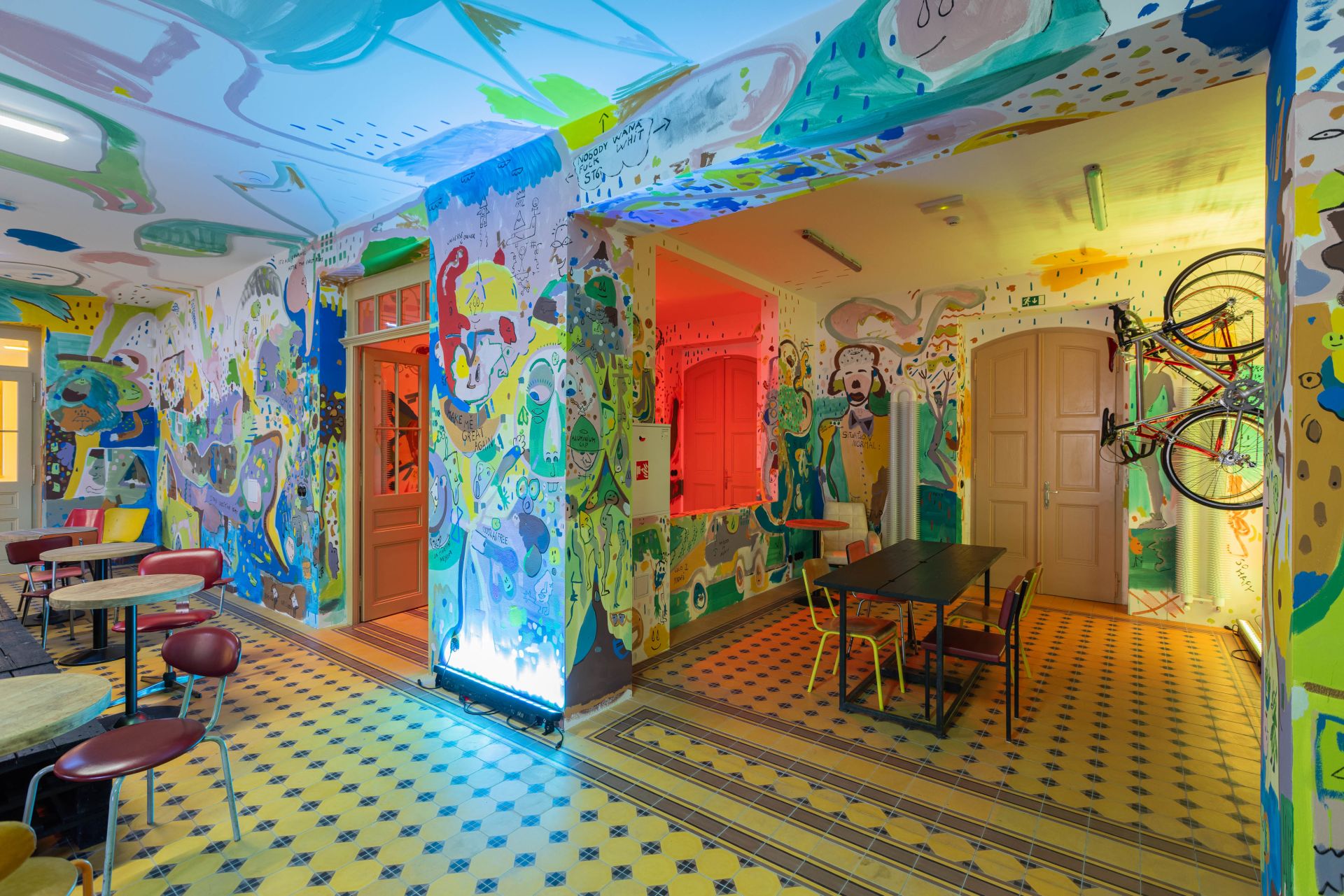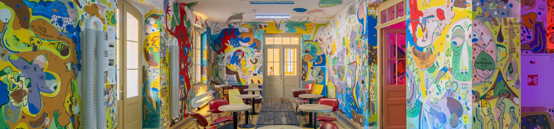 Umělecky vymalovaný sál, který svou kapacitou prodlužuje bistro.
