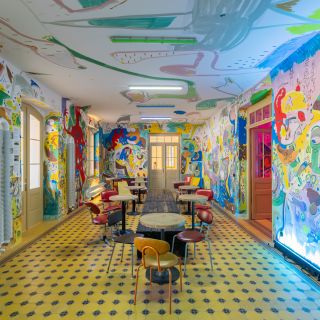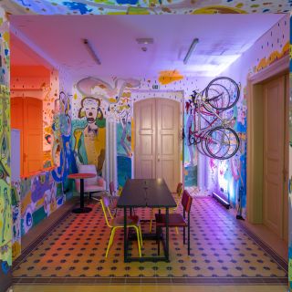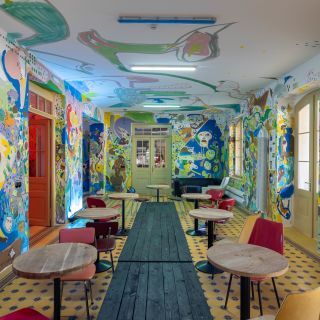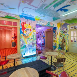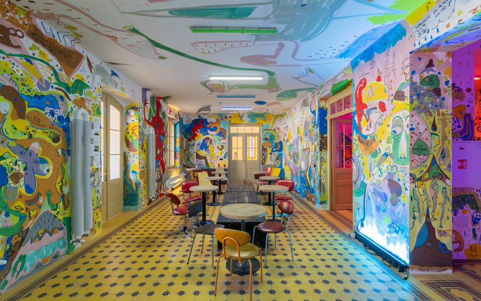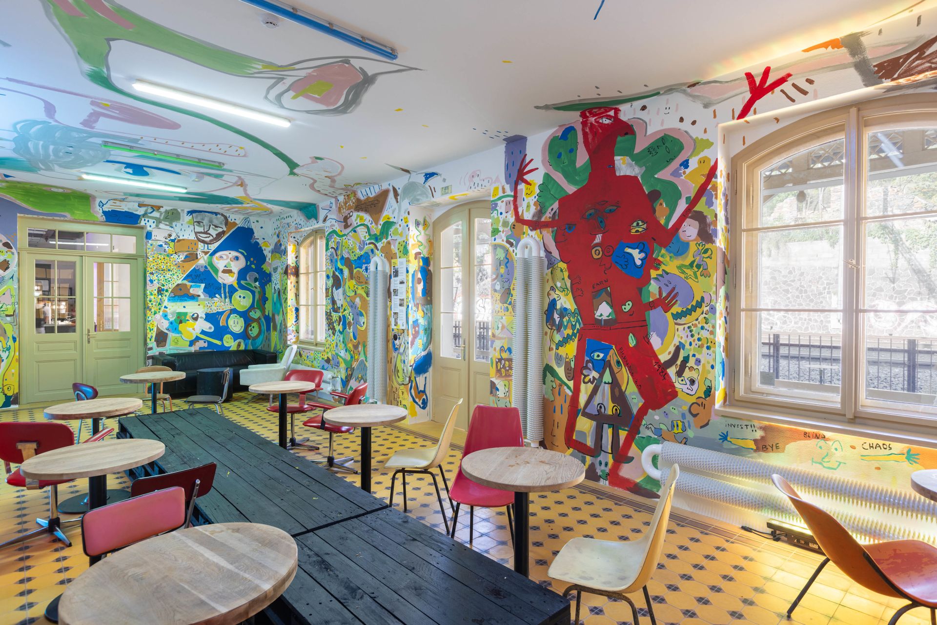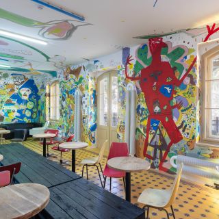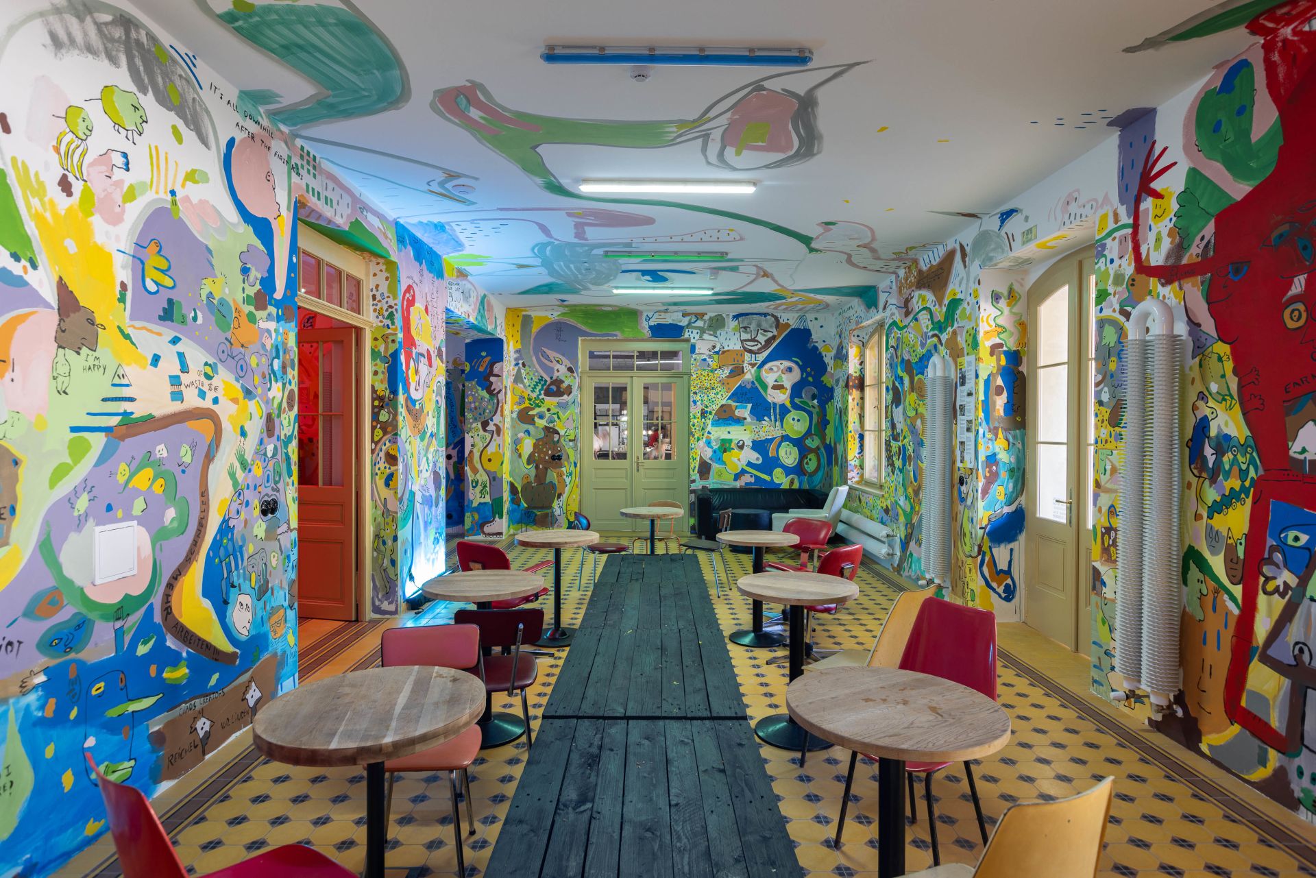 Umělecky vymalovaný sál, který svou kapacitou prodlužuje bistro.