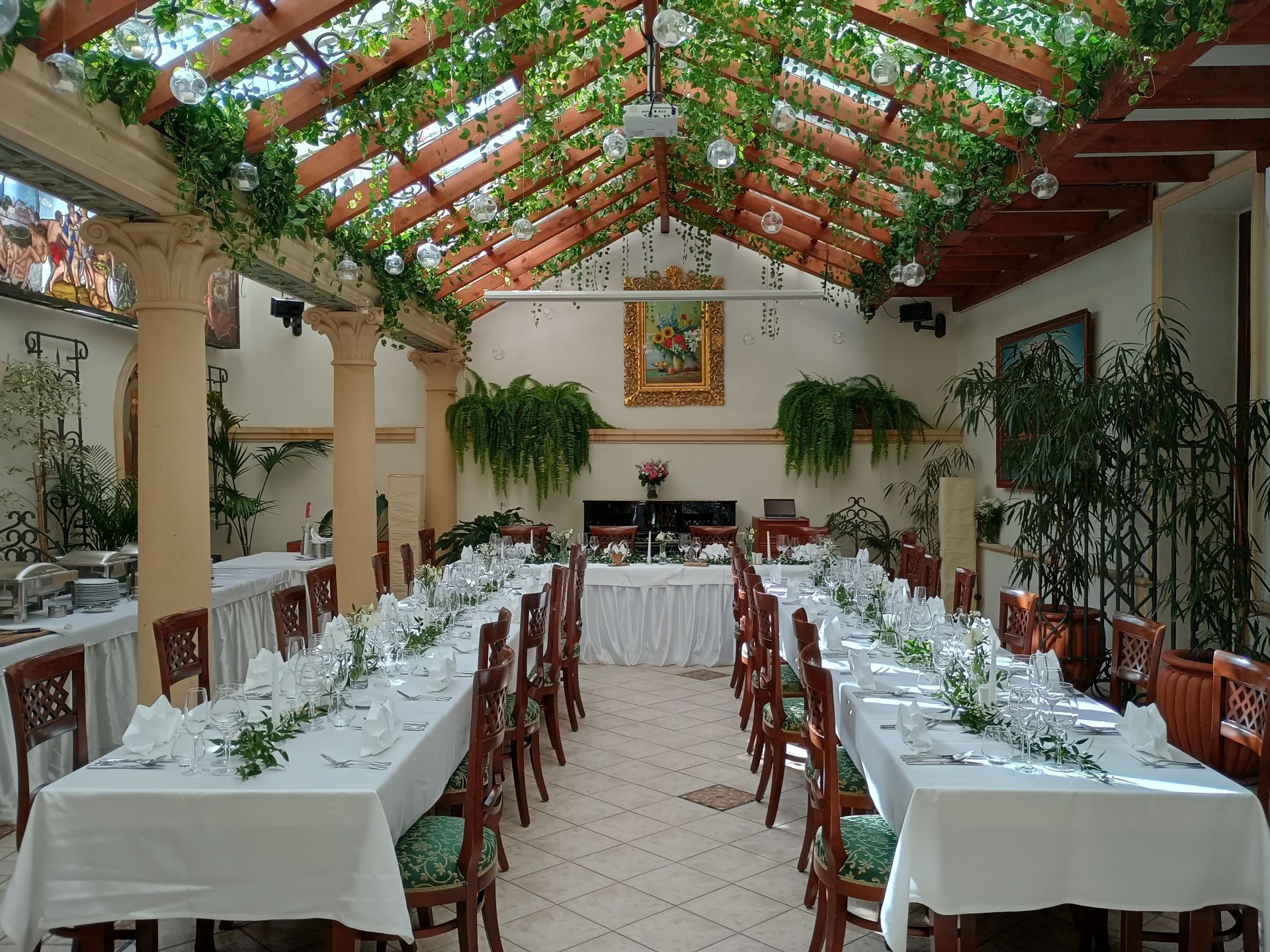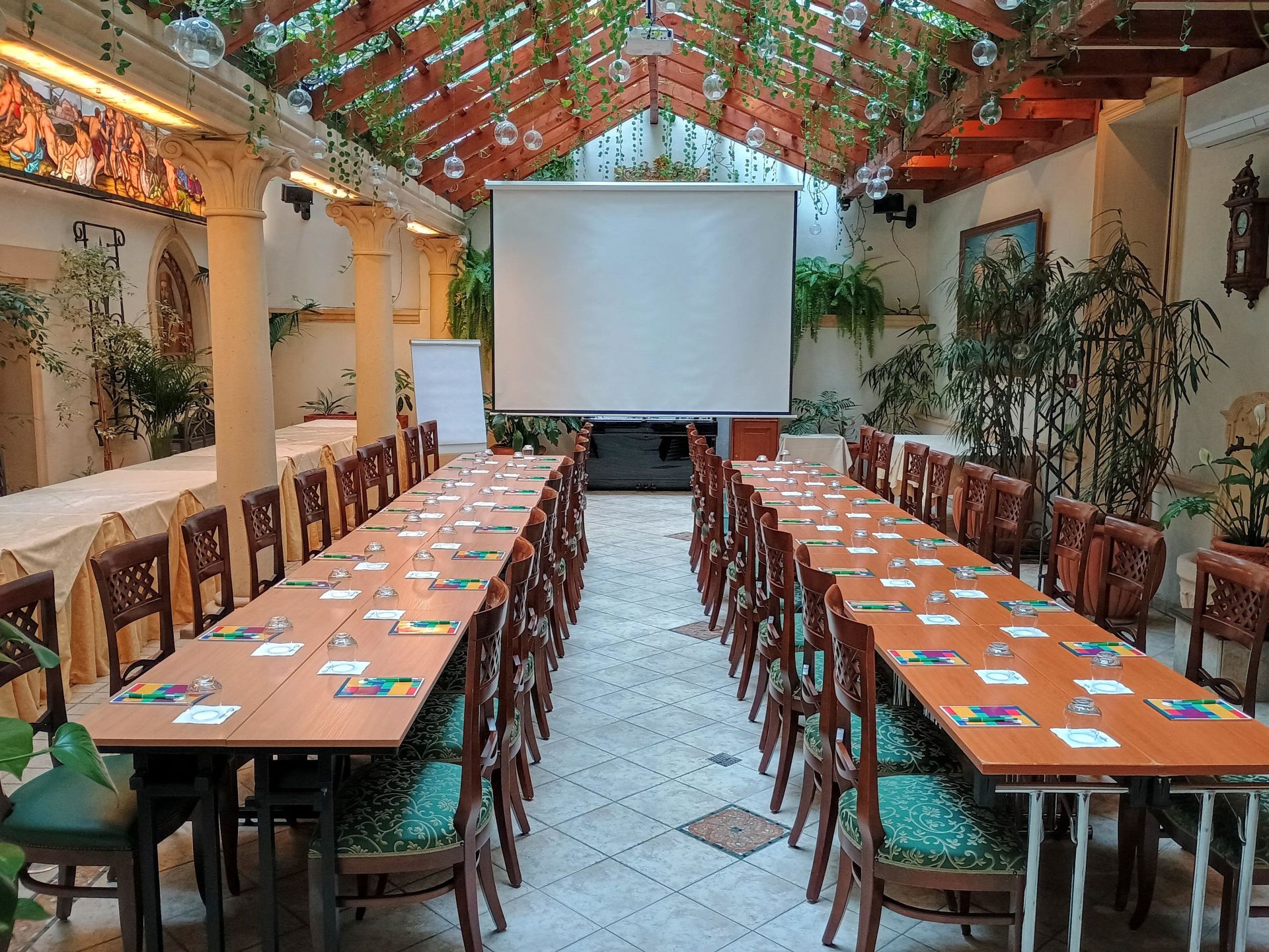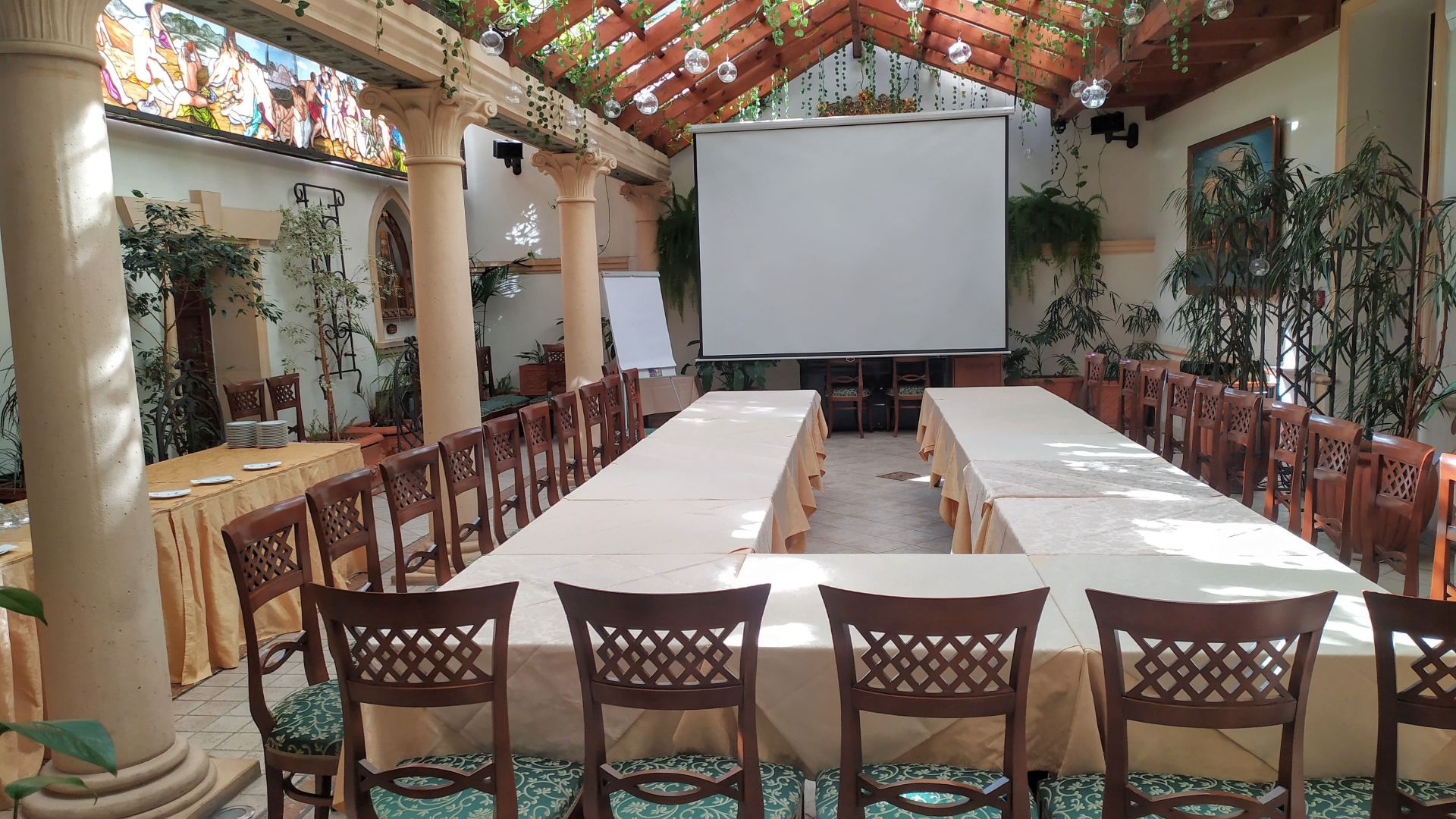 Hledáte oázu klidu v rušné části Prahy? Naleznete ji v jejich Zimní zahradě. Nejdříve Vás zaujme celkové originální řešení tohoto prostoru a určitě se zahledíte do celkové kompozice skleněné vitráže, která je vcelku dlouhá devět metrů. Je ideálním prostorem pro pořádání slavnostních rodinných i firemních akcí - firemních školení, prezentací, konference apod. K dispozici je také klavír s počítačem zn. Yamaha, umožňující samostatné hraní bez klavíristy. Green Garden Hotel nabízí netradiční konferenční prostory pro pořádání společenských akcí do počtu 60 osob. K dispozici je již zmíněná unikátní zimní zahrada, restaurace a 2 salonky.
