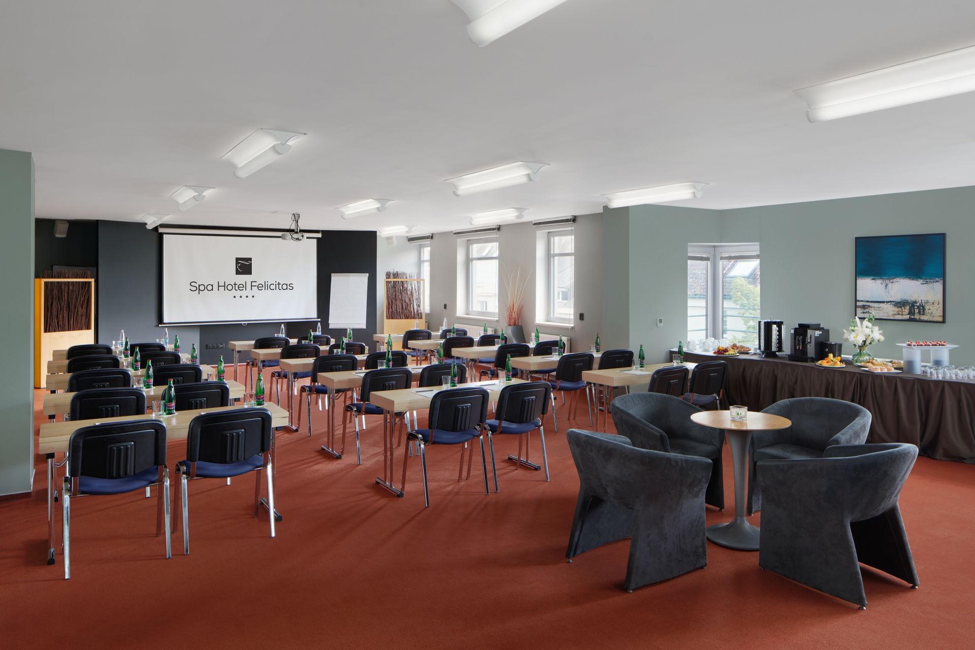 Spa Hotel Felicitas disponuje konferenční místností vhodnou pro jednání, meetingy, firemní akce, pracovní setkání a team buildingy, které lze spojit s unikátní nabídkou relaxačních masáží a rituálů ve Wellness & Spa s léčebnými procedurami v části Balneo & Medical. Hosté si mohou vychutnat skvělou gastronomii, která spojuje moderní a tradiční kuchyni.