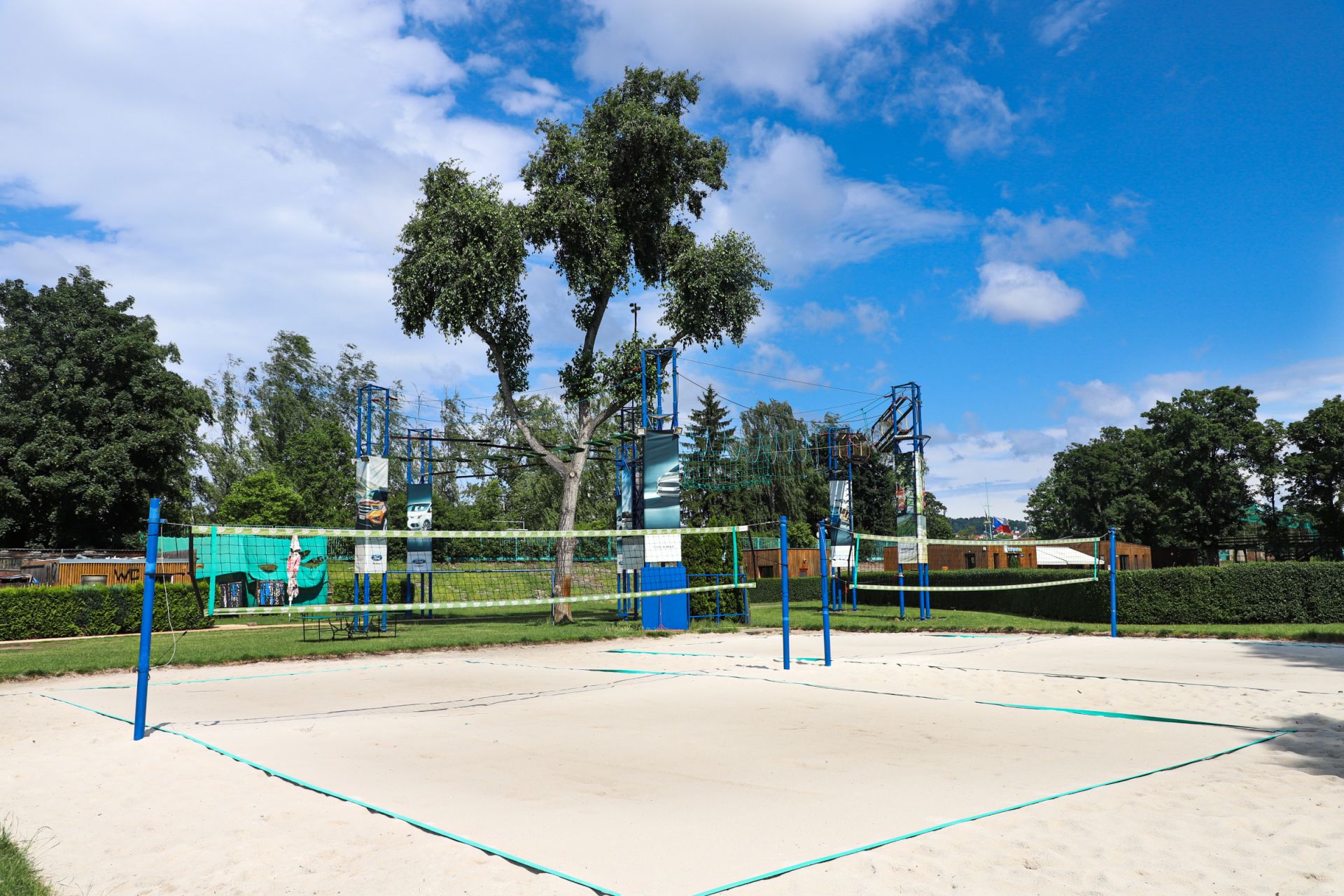 Dominantou areálu jsou beach volejbalové kurty, které nabízejí ideální podmínky pro rekreační hru i sportovně laděná setkání. Doplňuje je moderní hřiště na **padel tenis **– dynamický a přístupný sport, který je vhodný jak pro začátečníky, tak pro pokročilé hráče.