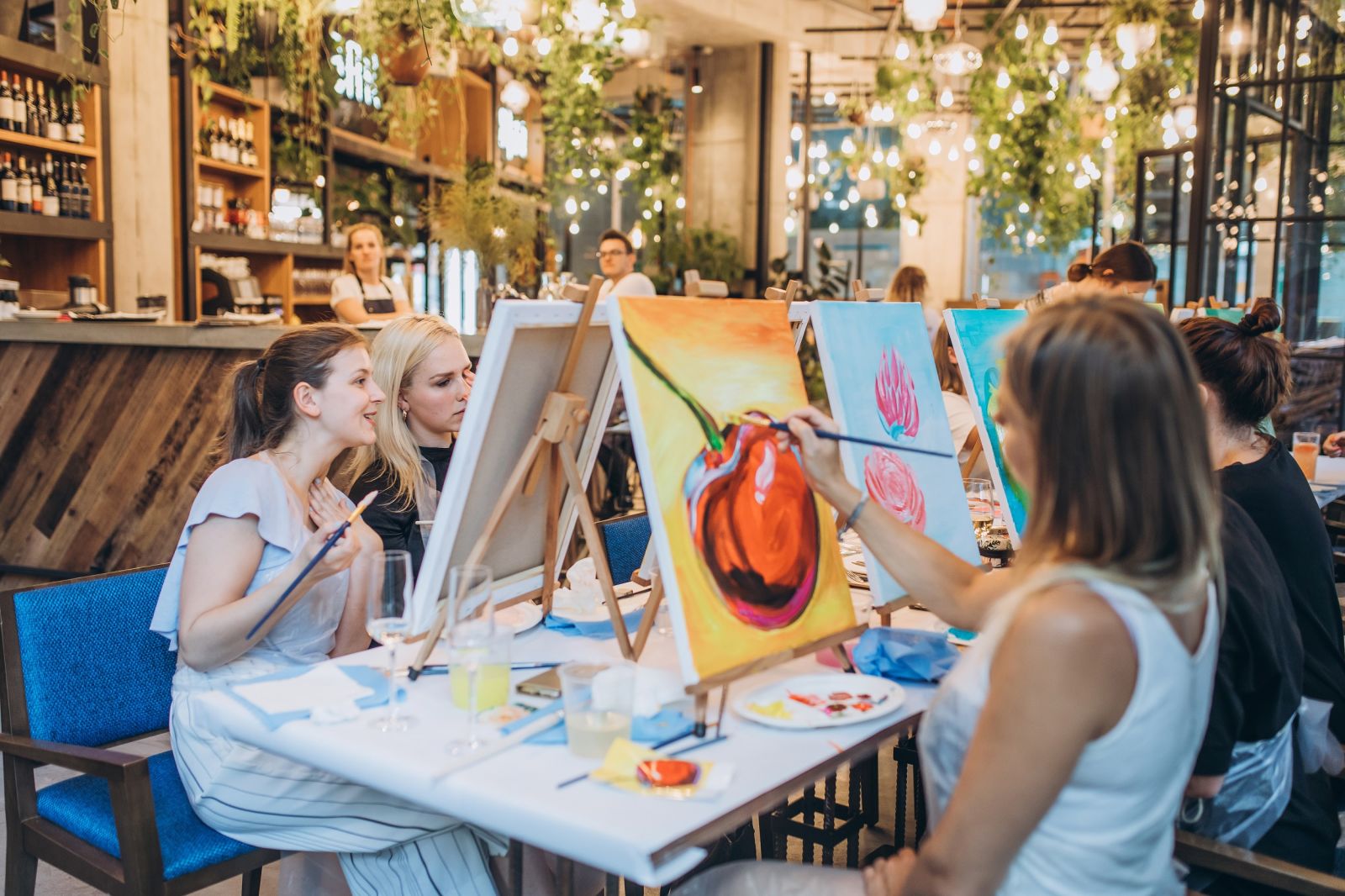 Koncept je jednoduchý. Za tři hodiny zvládnete namalovat stylový obraz, který si na konci večera odnesete domů. A spolu s ním i dobrou náladu a vzpomínky na nezapomenutelný večer strávený s kolegy. Lektoři a lektorky se vám budou po celou dobu večera věnovat a rádi se vším poradí. Obraz opravdu zvládnou hravě dokončit i ti, kteří s malováním nemají žádné zkušenosti. V průběhu večera se najde čas na poklábosení, výborné občerstvení i lahodné drinky.
